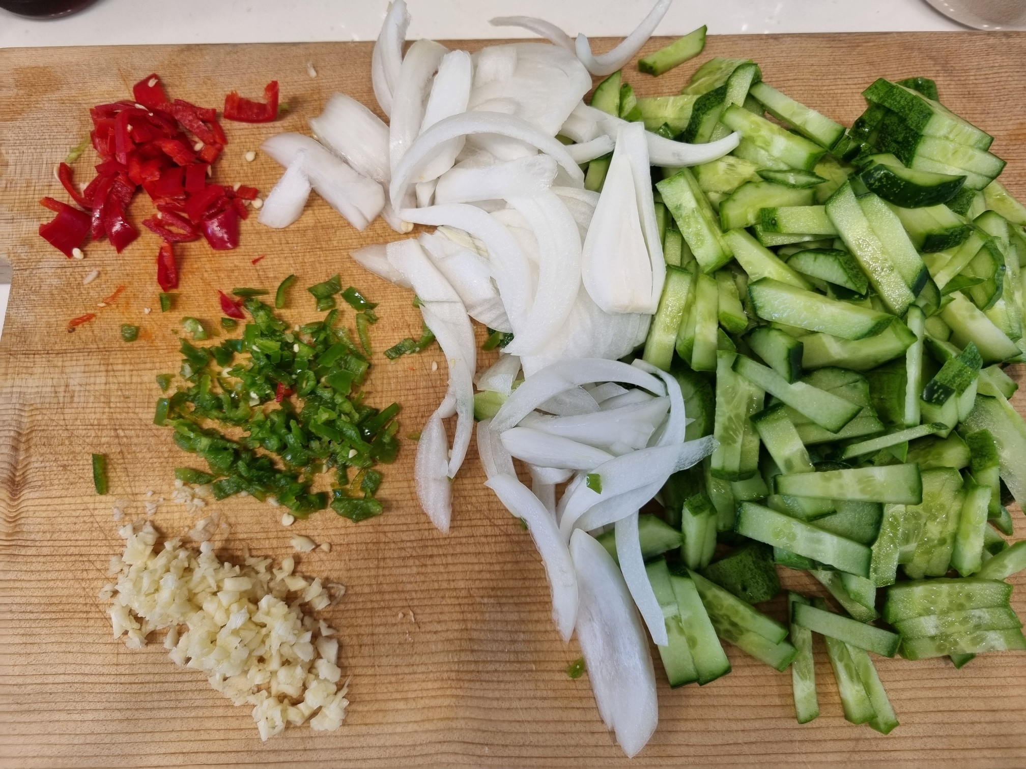 1. 먼저 야채들을 잘 손질해줍니다. 오이는 채썰어주시고 양파는 얇게 썰어주세요. 마늘은 다져주시고 홍고추는 길쭉하게, 청양고추는 역시나 작게 다져줍니다.